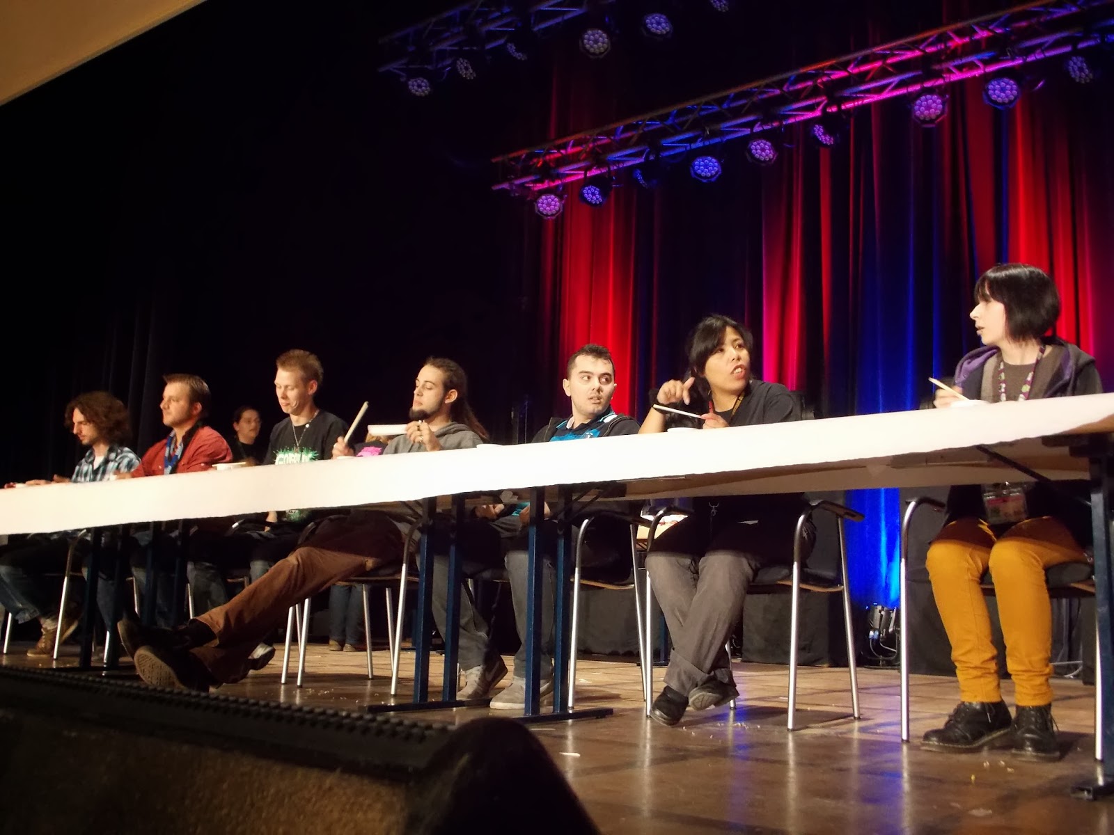 Am Sonntag war der Tag schon etwas besser, es regnete nicht mehr aber etwas kühl war es trotzdem. Ganz schön früh begann der deutsche Vorentscheid zum World Cosplay Summit, der Cosplay Weltmeisterschafft. Zwölf Teams stellten sich der Herausforderung Deutschland beim Finale in Nagoya, Japan zu vertreten. Mit ein paar technischen Hoppalas startete der Vorentscheid mit einem gut gefüllten Saal. Die Jury (bestehend aus international bekannten Cosplayern) kürte unter bedacht strenger Regeln das Team „Peilosistas“ bestehend aus Eva & Anna (als Miyuki-chan und Rosenmädchen aus „Miyuki-chan im Wunderland“) zum Sieger! Neben dem Hauptpreis, der Teilnahme am WCS in Japan, gab es dieses Jahr noch Sonderpreise. Der Schreiber mit der besten Bewerbung (Team: Dogcookie) bekam ein Zeichentablett von Wacom. Der beste Audio-Track (Team: Awesome) wurde mit einem hochqualitativen Headset von Razer belohnt und MyCostumes sponserte einen 250-Euro-Gutschein an das beste Kostüm (Team: Kasselfornia Girls). Die Firma Nintendo vergab an das Zweitplatzierte Team (Team: Dogcookie) zwei 3DS XL-Konsolen. Der Preis für das vorbildlichste Team bekam das Team Kasselfornia Girls.