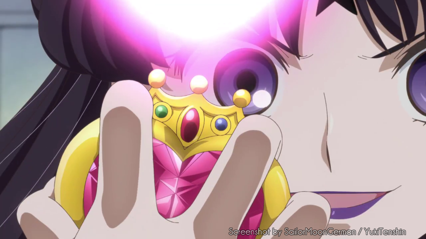 Nach dem Opening geht es dann auch sofort weiter und wir sehen die Verwandlung in Super Sailor Moon. Die drei Talismane der Outers reagieren äußerst heftig und sorgen dafür, dass der heilige Gral Sailor Moon zu ihrem Upgrade verhelfen kann. Die anschließende Verwandlung ist schön lang und nicht so kurz wie damals. Aber sie leuchtet noch genauso schön in den Regenbogenfarben. Das Opening ließ es ja schon immer erahnen, aber Sailor Moon hat wirklich „nur“ ihren blauen Kragen. Ich hätte es ganz schön gefunden, wenn auch dieser in Regenbogenfarben gewesen wäre. Aber immerhin ist die Schlusspose dieser Verwandlung sehr schön. Im gleichen Zug bekommen auch die anderen Senshi ihr Upgrade, erkennbar an der Veränderung der Broschen von einem Kreis in ein Herz.