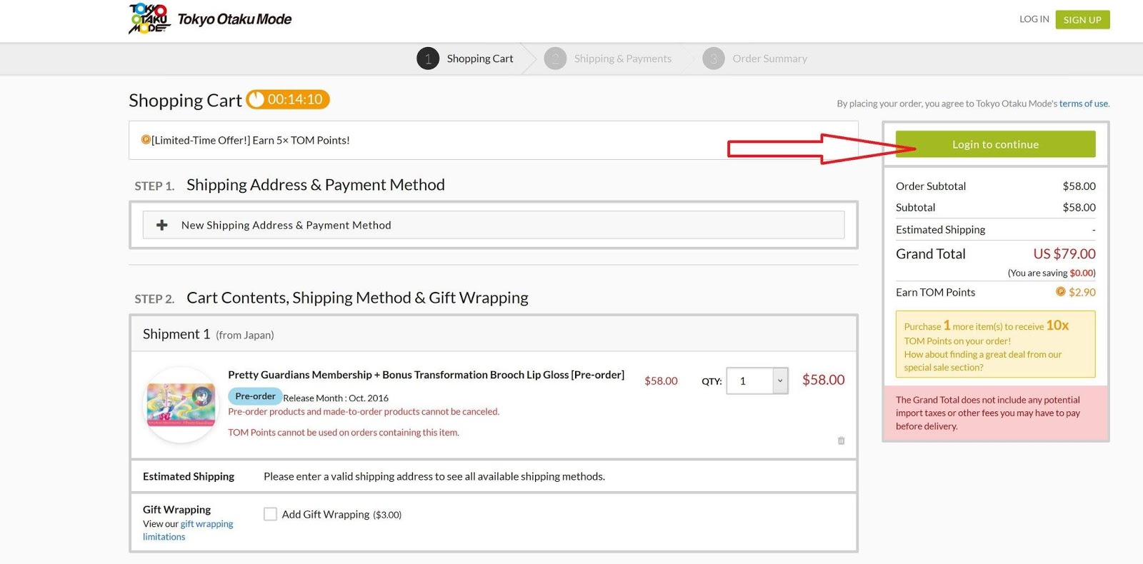 Um Fortzufahren, klickt zur Bestätigung „View Cart„! Nun heißt es, sich erst einmal bei der Otaku-Mode-Plattform anzumelden. Dazu klickt ihr rechts auf den grünen Button namens „Login to continue„! Nun könnt ihr euch einen Account anlegen oder euch schnell via Facebook z.B. einloggen. Wir empfehlen hierbei, sich die Zeit zu nehmen, um einen neuen Account anzulegen, bei dem ihr auch eure Lieferadresse, etc., eingeben könnt.